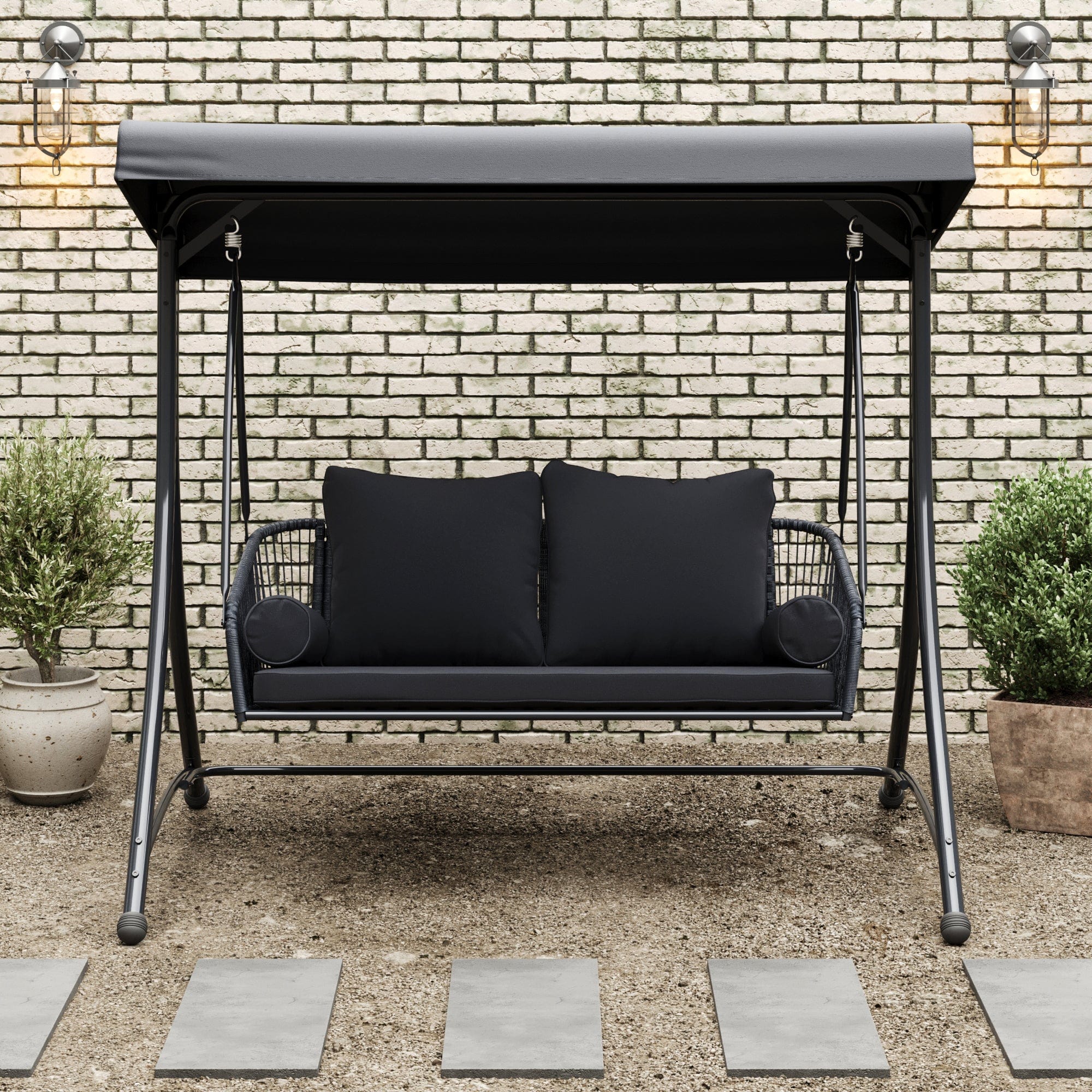 Relax in modern comfort with the East Green Ramona Patio Swing, featuring a rust-resistant metal frame, plush all-season performance olefin cushions, and a sleek monochromatic design. An adjustable, removable canopy offers customizable shade, while built-in comfort springs and marine-grade rope details add durability and style. Designed for all-day lounging, it combines strength, stability, and thoughtful details for a refined outdoor experience.