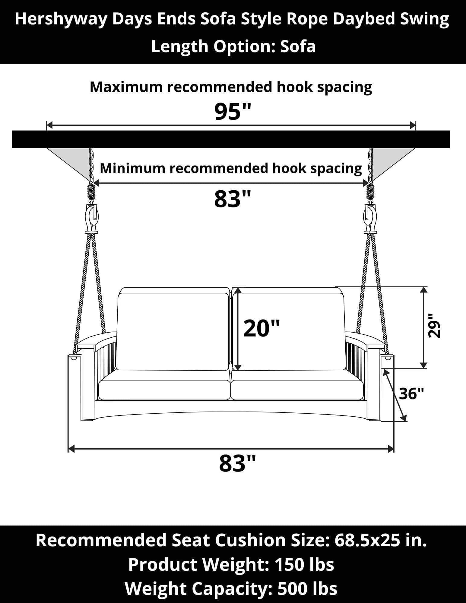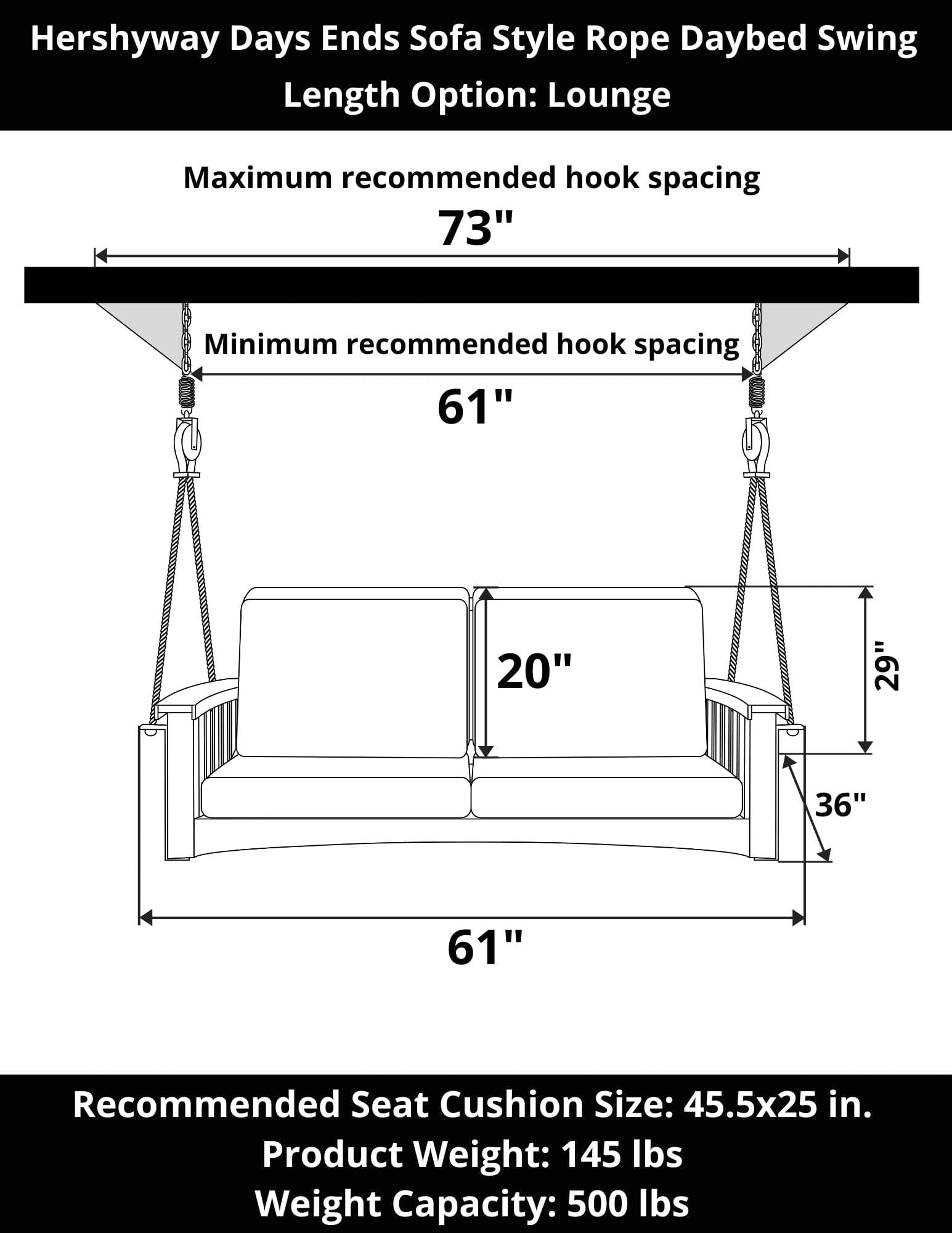 Experience the ultimate in outdoor relaxation with the Hershyway 5 Foot Days Ends Sofa Style Rope Daybed Swing. Made in the USA by authentic Amish craftsman, this swing is crafted from durable, all-weather cypress wood. The deep seating Sunbrella cushions and included rope, springs, and chain provide unparalleled comfort. Add a touch of luxury to your outdoor space.
